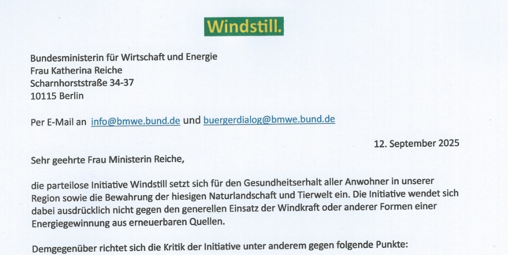 die parteiunabhängige Initiative „Windstill.“ ist ein Zusammenschluss betroffener Bürger im Raum Mettmann. Innerhalb dieses Raumes sollen zwischen Mettmann, Obschwarzbach und Ratingen-Homberg gemäß einer Planung der Bezirksregierung Düsseldorf Windenergieanlagen in unbegrenzter Höhe bei gleichzeitig deutlich verringerten Abständen zu bestehender Wohnbebauung zulässig